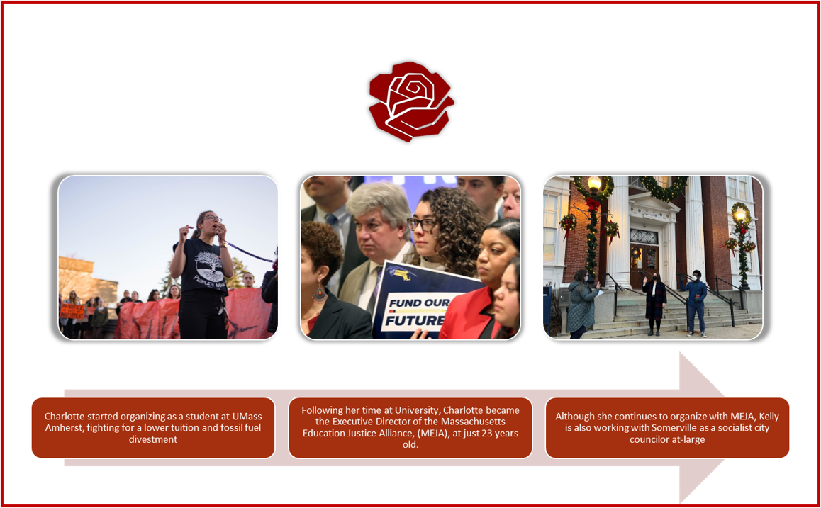 Throughout college, Kelly spent her time as a prominent student organizer. However, it was only after university, though, when Kelly started organizing in the outside world, where she truly embraced the label of a socialist. Using her skills as a student organizer, she became the Executive Director of the Massachusetts Education Justice Alliance. MEJA fights for equality for teachers and students in Massachusetts schools. Unlike those, who had heard the stapler, and ran from it, Kelly leapt towards it.