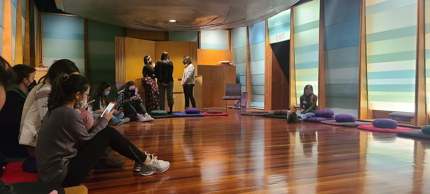 Postdoctoral scholars and first-year students removed their shoes and sat on the purple and pink cushions as the event started. The faculty organizers emphasized the comfort of the students. The gathering started with a list of community agreements and a brief meditation.